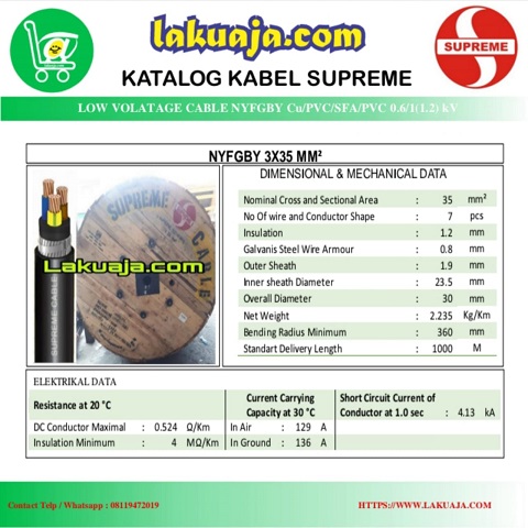 Jual Kabel Listrik NYFGBY 3×35 mm / NYFGBY 3x35mm / NYFGBY 3 x 35 mm. Product yang kami jual adalah kabel merk Supreme. Untuk permintaan kabel merk lain (kabel Metal, Kabel Eterna, Kabel Jembo, Kabelindo dll) Anda bisa menghubungi kami melaui telp, whatsapp atau email yang tertera dibawah.