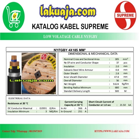 Jual Kabel Listrik NYFGBY 4×185 mm / NYFGBY 4x185mm / NYFGBY 4 x 185 mm. Product yang kami jual adalah kabel merk Supreme. Untuk permintaan kabel merk lain (kabel Metal, Kabel Eterna, Kabel Jembo, Kabelindo dll) Anda bisa menghubungi kami melaui telp, whatsapp atau email yang tertera dibawah.