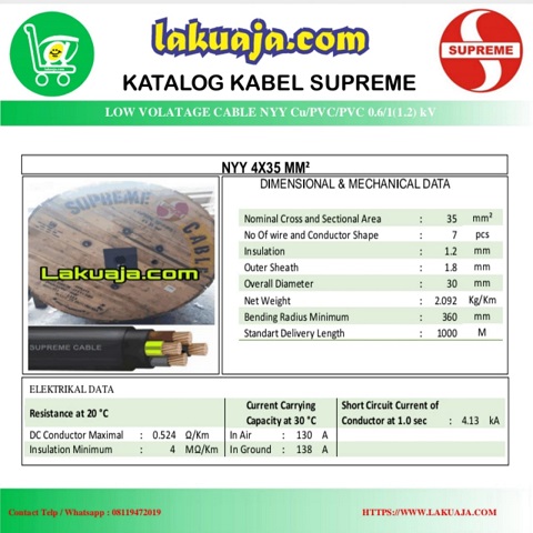 Jual Kabel Listrik NYY 4×35 mm. Product yang kami jual adalah kabel merk Supreme. Untuk permintaan kabel merk lain (kabel Metal, Kabel Eterna, Kabel Jembo, Kabelindo dll) Anda bisa menghubungi kami melaui telp, whatsapp atau email yang tertera dibawah.